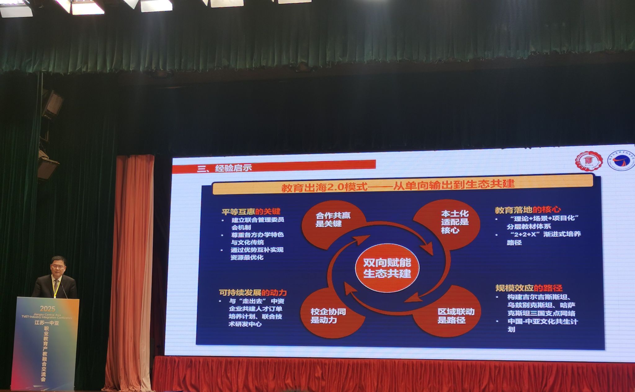 在“职教出海中亚探索与实践”主题分享环节,濮励杰以“深化产学研用,共创郑和学院人才培养新模式”为题,介绍了我校在吉尔吉斯斯坦建设郑和学院的实践经验。主题分享环节由陈建华主持。