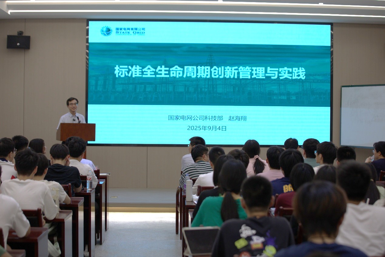 在与会人员的共同见证下,《电力标准化》产教融合课程正式揭牌,赵海翔作为首期课程第一讲主讲人,以“标准全生命周期创新管理与实践”为主题,为课程首期学员——电力中外221和222班学生授课。