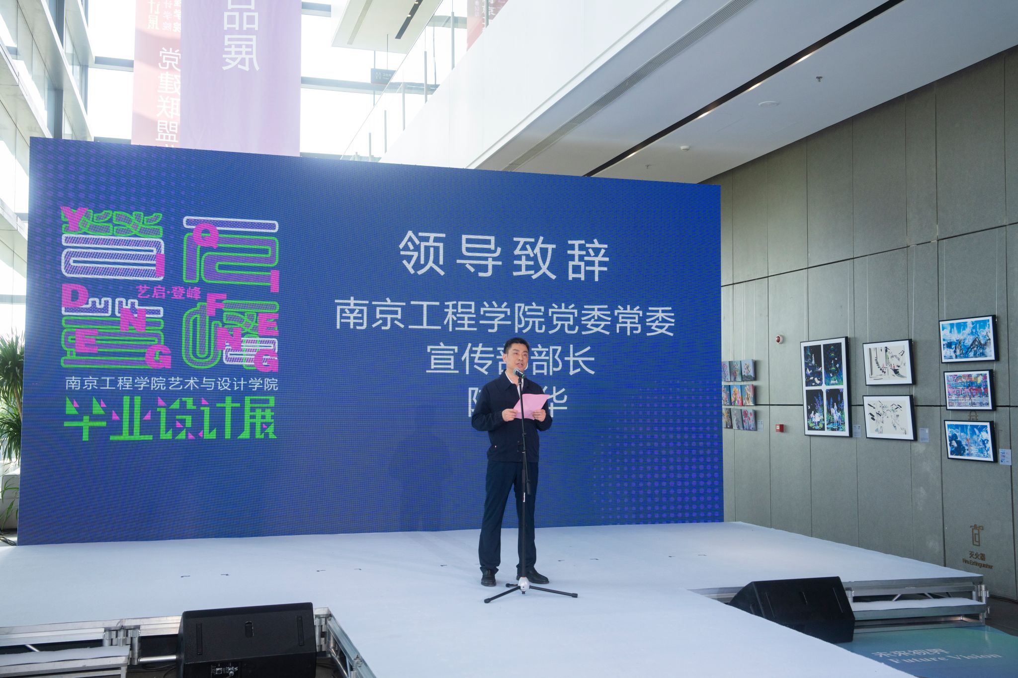 4月18日上午,我校艺术与设计学院以“艺启·登峰”为主题的毕业设计展在江宁美术馆盛大开幕。党委书记孙爱武出席活动,并宣布展览开幕。党委常委、宣传部部长陈建华,江宁区委宣传部副部长、文明办主任袁才方,江宁区文化和旅游局党委书记、局长陈敏,江宁区科协主席黄正勇, 江宁区文化和旅游局副局长张丽丽,中国工艺美术大师张清雷,江苏华泽控股集团有限公司董事长、校友代表戴福书,南京地区兄弟院校艺术设计学院负责人以及我校相关职能部门负责人、艺术与设计学院党政负责人以及师生代表参加活动。