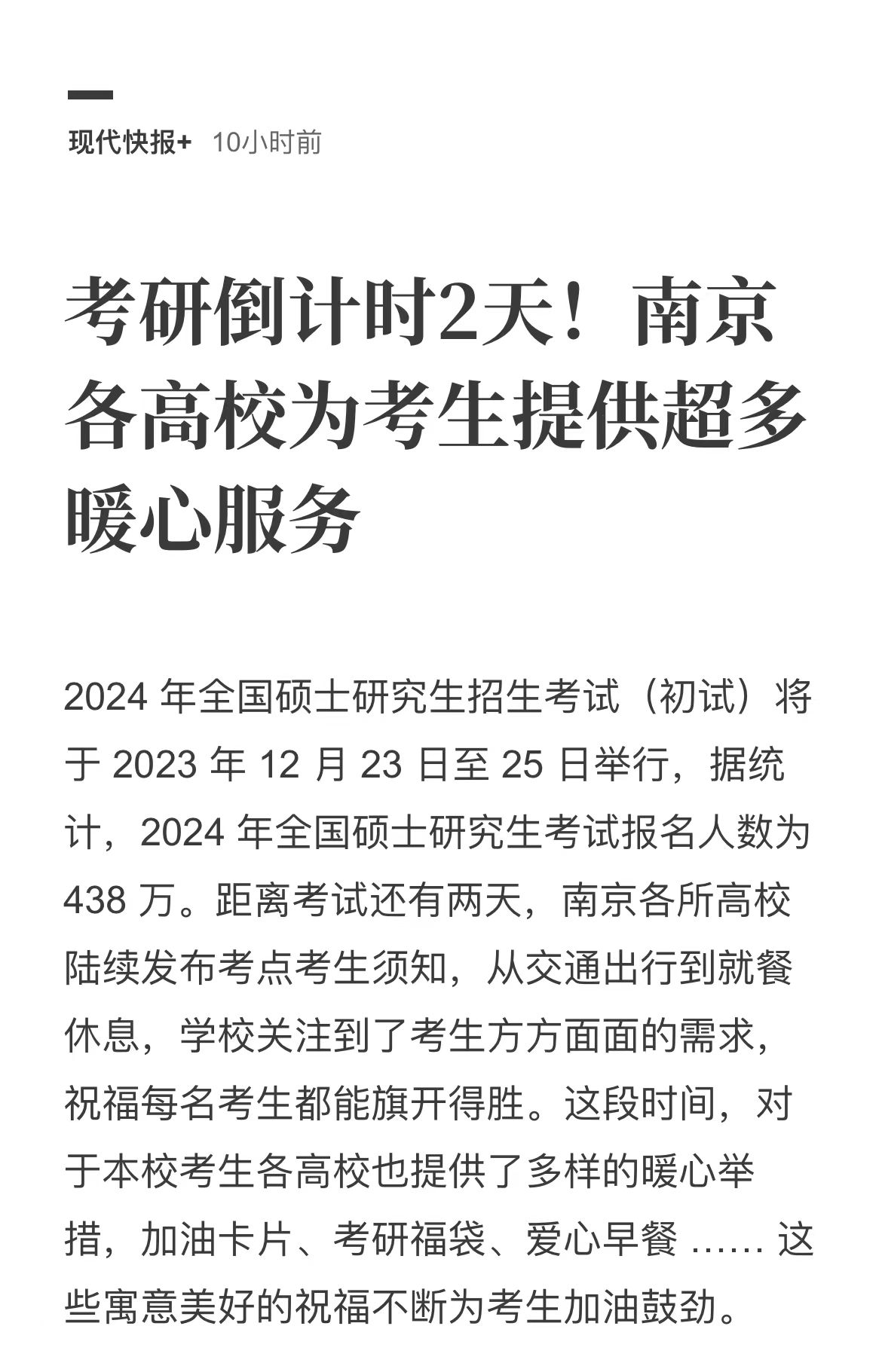 2024 年全国硕士研究生招生考试(初试)将于 2023 年 12 月 23 日至 25 日举行,据统计,2024 年全国硕士研究生考试报名人数为 438 万。距离考试还有两天,南京各所高校陆续发布考点考生须知,从交通出行到就餐休息,凯发关注到了考生方方面面的需求,祝福每名考生都能旗开得胜。这段时间,对于本校考生各高校也提供了多样的暖心举措,加油卡片、考研福袋、爱心早餐 …… 这些寓意美好的祝福不断为考生加油鼓劲。