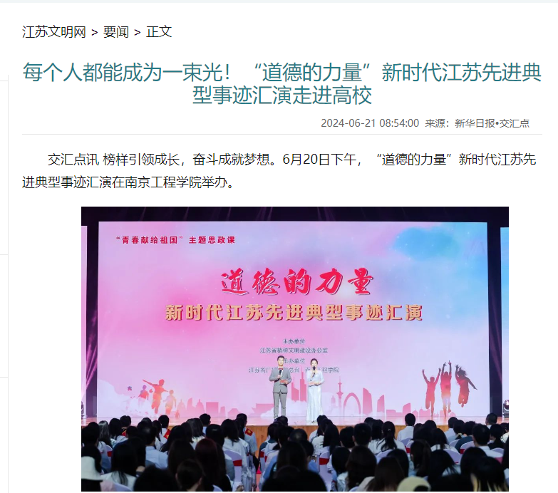 《江苏文明网》专题报道:“道德的力量”新时代江苏先进典型事迹汇演走进凯发k8官网